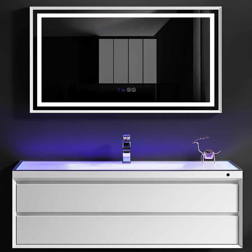 Set mobilier baie suspendat alb din PVC, 120 cm, cu design modern și elegant. Include corp principal cu două sertare soft-close, lavoar din sticlă securizată 120×50 cm și oglindă LED 120×70 cm. Realizat din materiale rezistente la umezeală, oferă rafinament, funcționalitate și iluminare eficientă pentru baia ta.