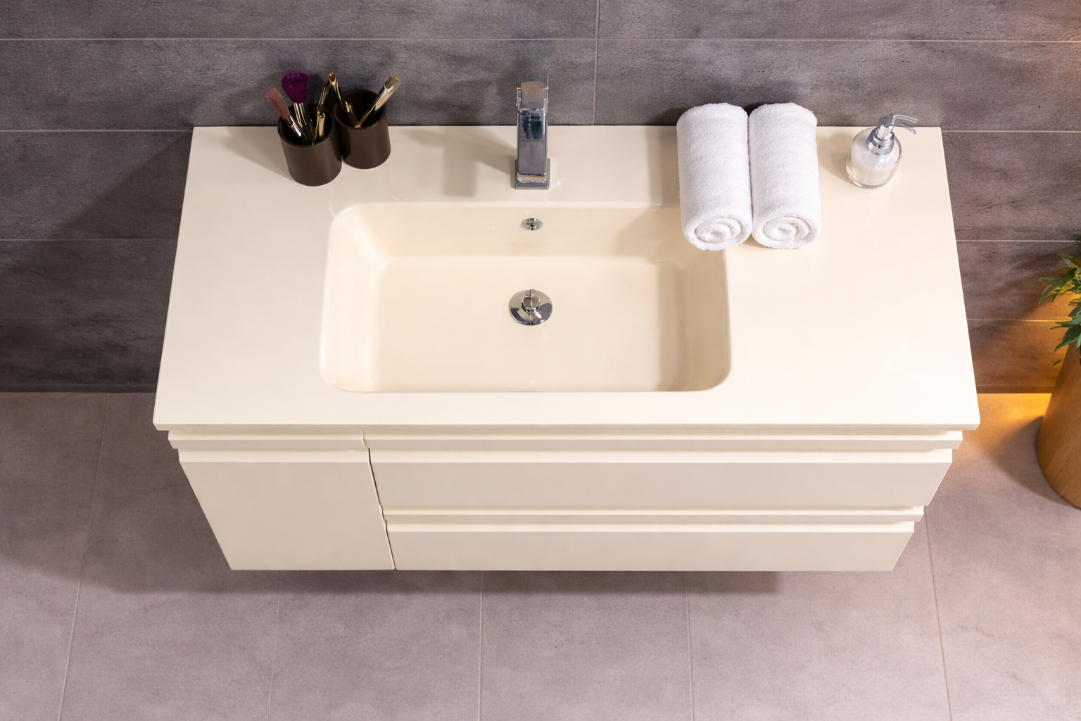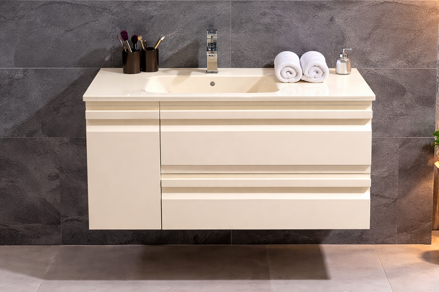 Acest set de mobilier pentru baie combină designul modern cu rafinamentul unei nuanțe calde de crem și rezistența materialelor premium. Realizat din PVC de înaltă calitate, complet rezistent la umiditate, setul include mobilierul principal suspendat, lavoar din sticlă securizată și o oglindă LED cu iluminare modernă. Este alegerea ideală pentru băi elegante, contemporane și ușor de întreținut.
