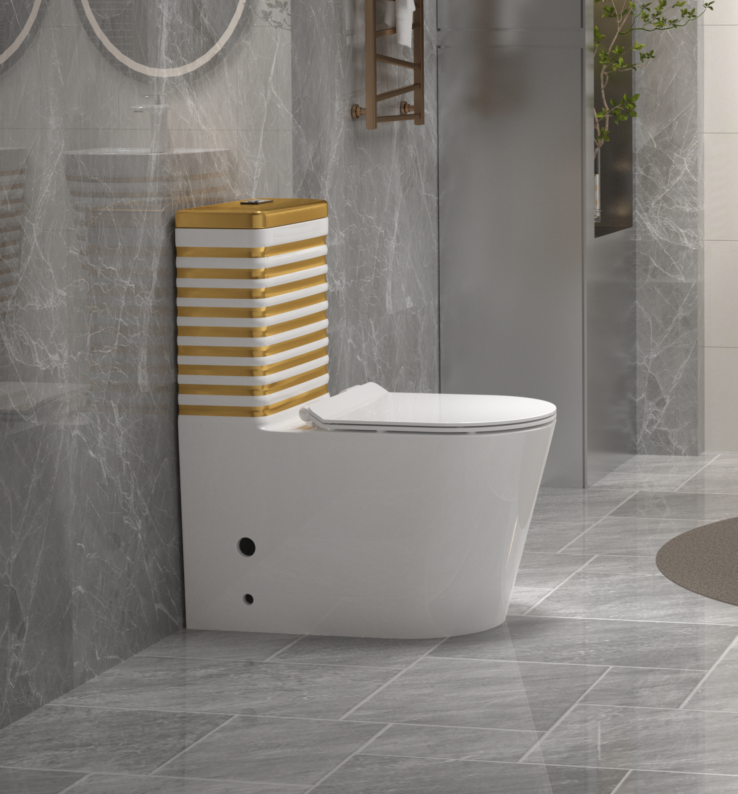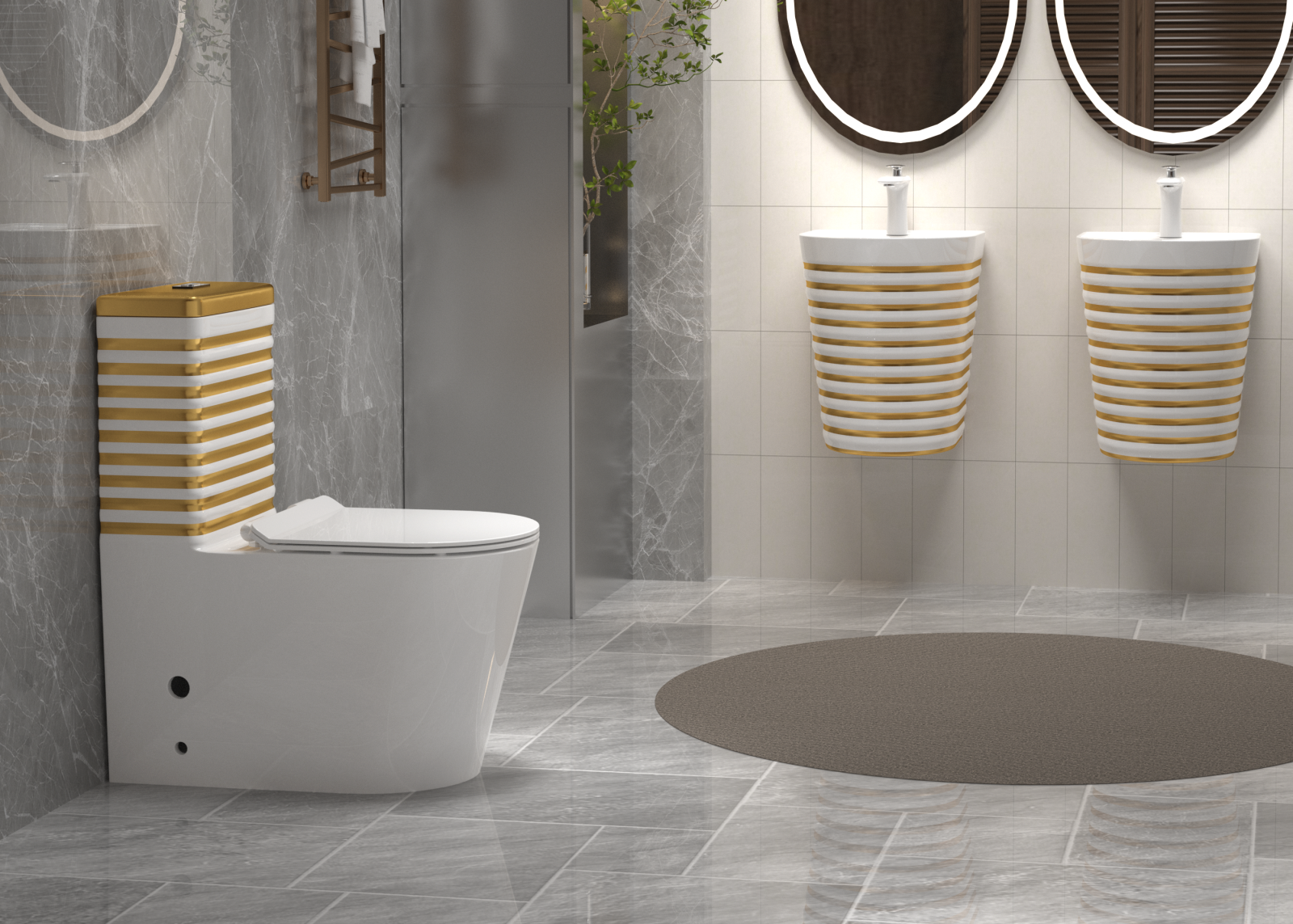 Acest set WC premium îmbină eleganța clasică a ceramicii albe cu accente aurii sofisticate, transformând orice baie într-un spațiu modern și luxos. Designul său unic, cu rezervor decorat în lamele aurii, adaugă rafinament și un aspect distinctiv, în timp ce tehnologiile integrate asigură confort, igienă și funcționalitate de top.