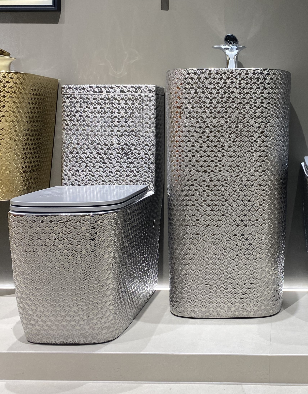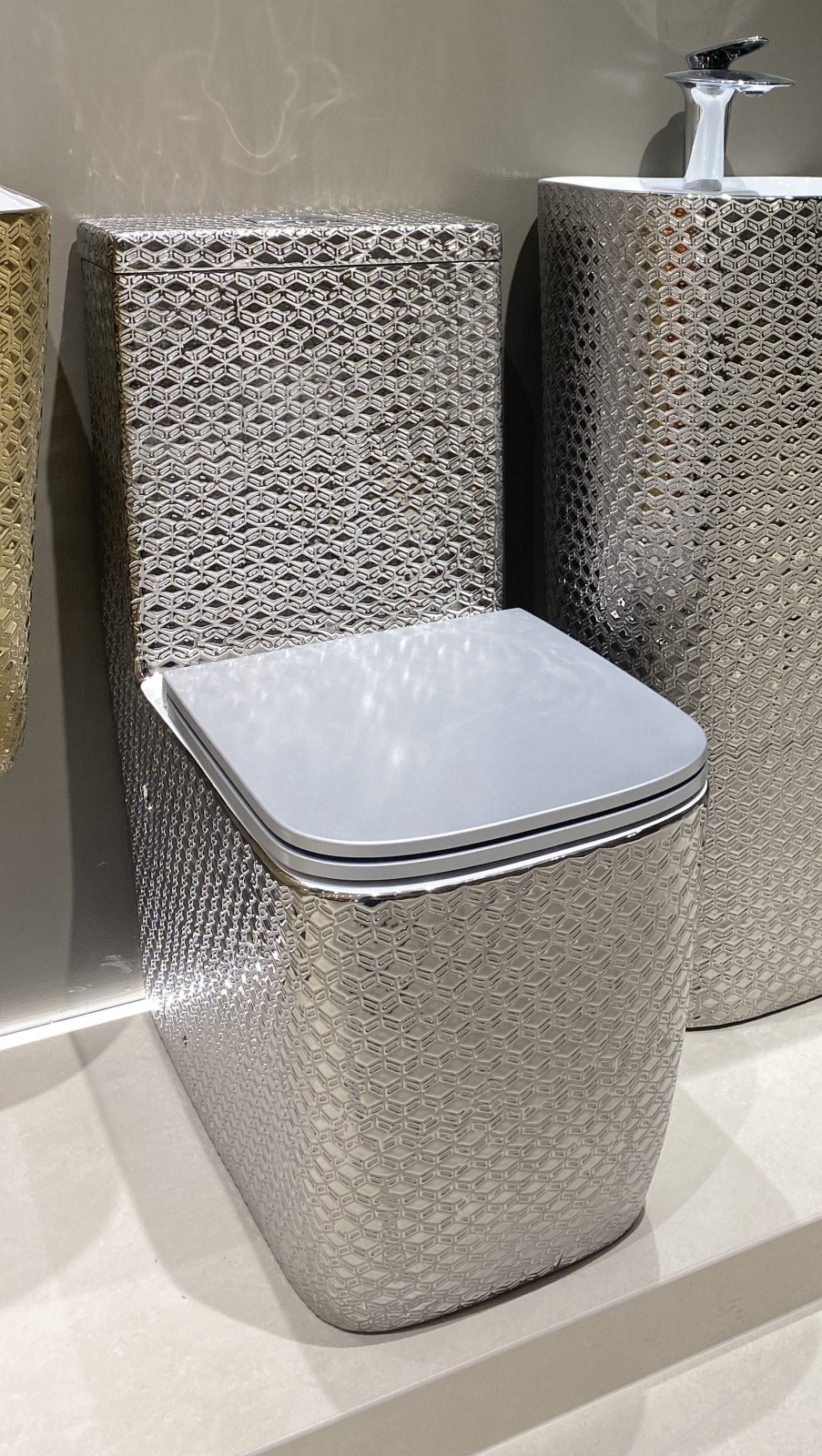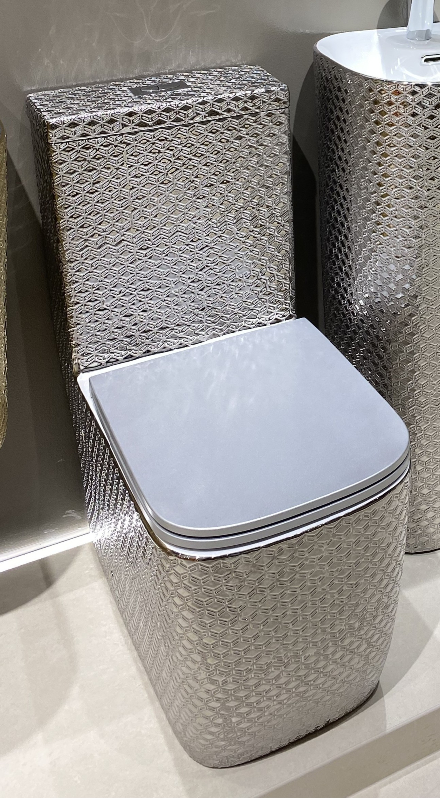 Acest set de vas WC cu finisaj argintiu reprezintă o alegere exclusivistă pentru băile moderne, aducând un plus de eleganță și personalitate. Modelul impresionează prin textura geometrică 3D și suprafața metalizată, care transformă vasul WC într-o piesă statement, ideală pentru amenajări premium.