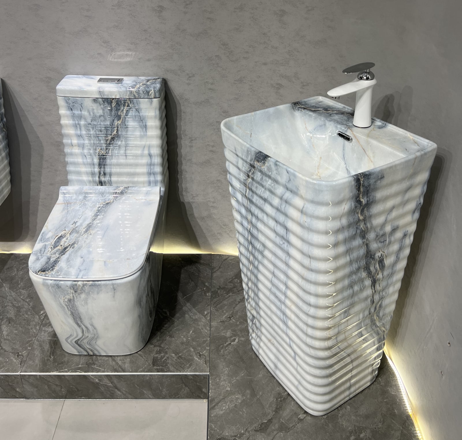Acest set de vas WC cu finisaj marmură alb-gri reprezintă combinația ideală între designul elegant inspirat de piatra naturală și tehnologia modernă pentru confort și igienă. Modelul este conceput pentru băile contemporane care pun accent pe estetică premium, durabilitate și funcționalitate avansată.