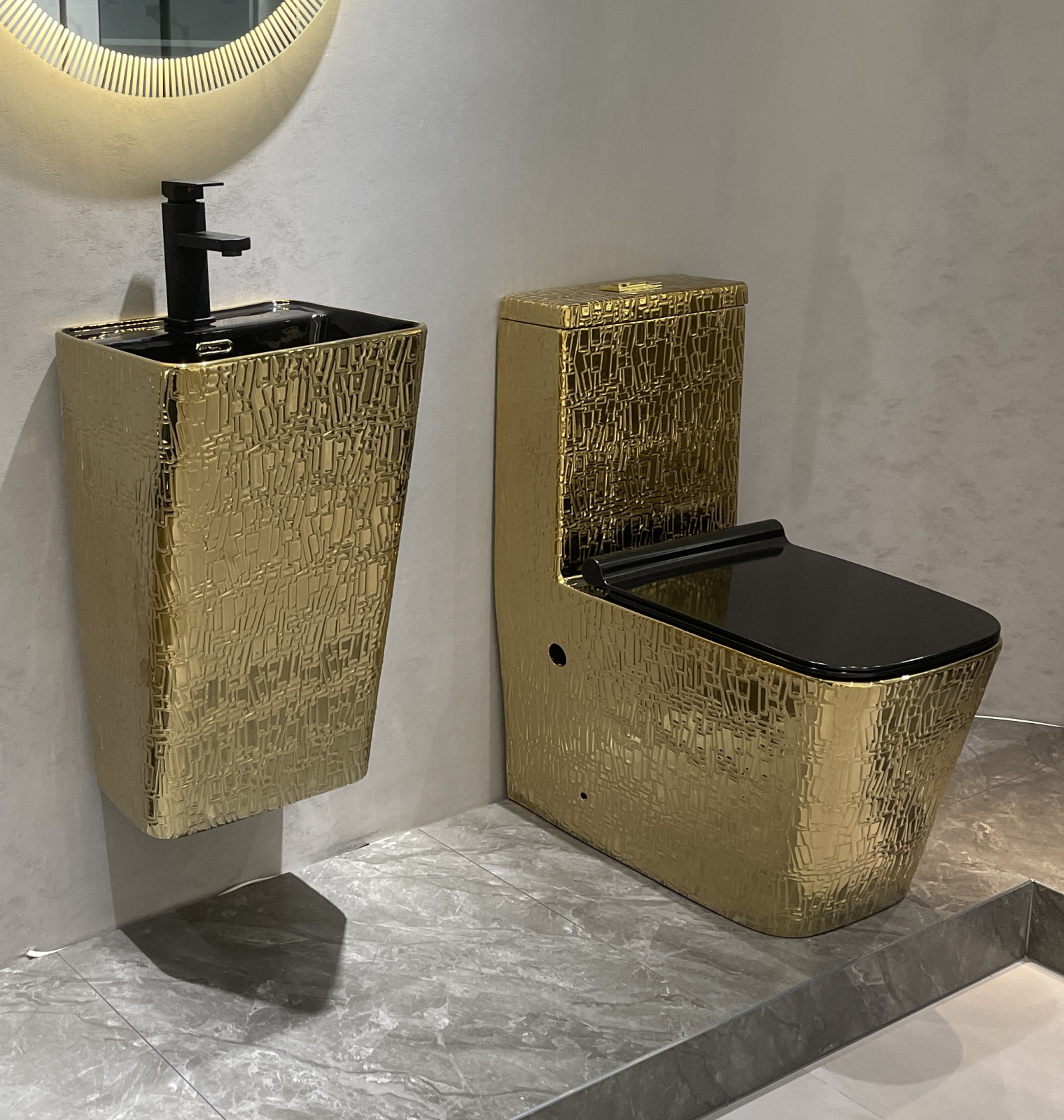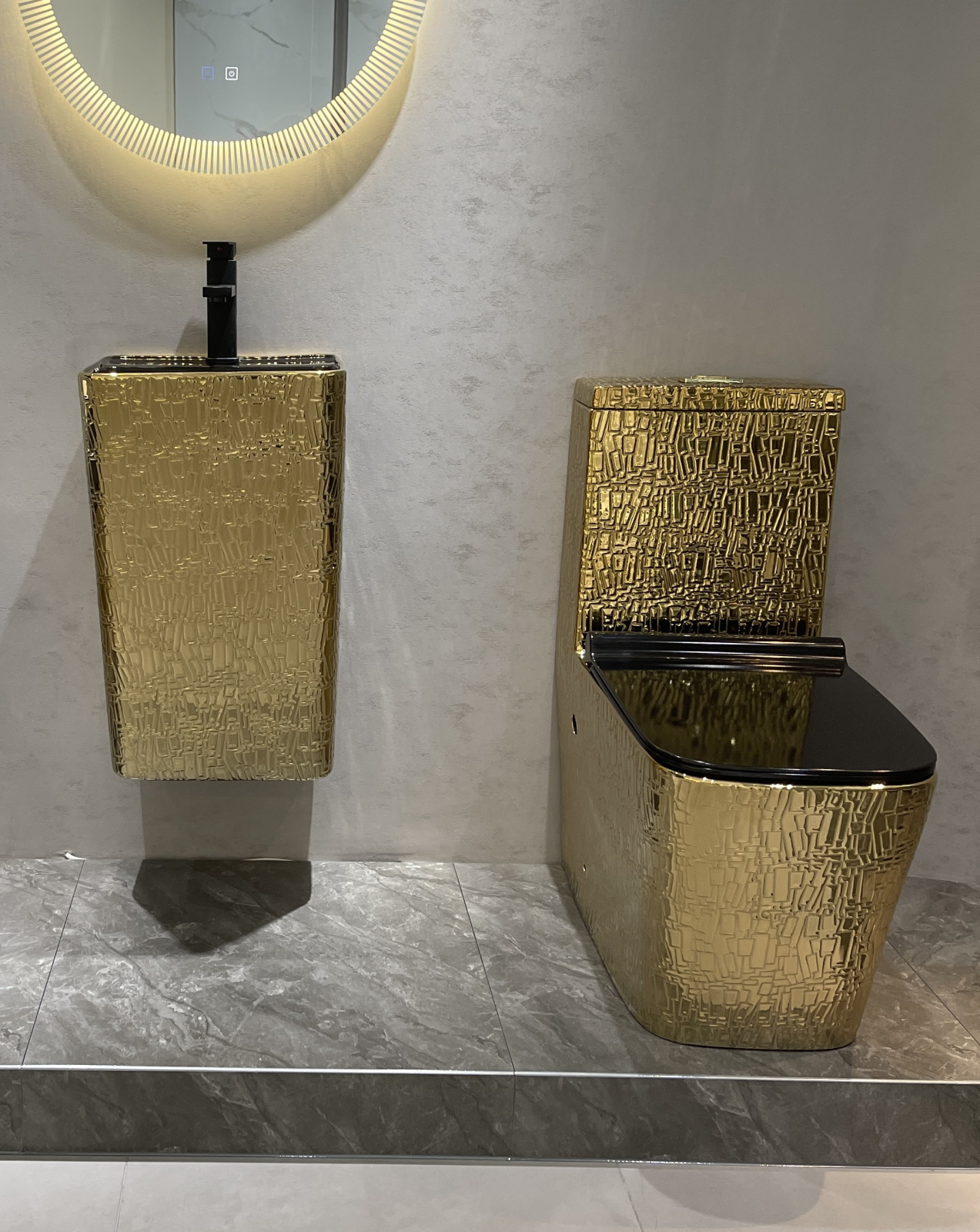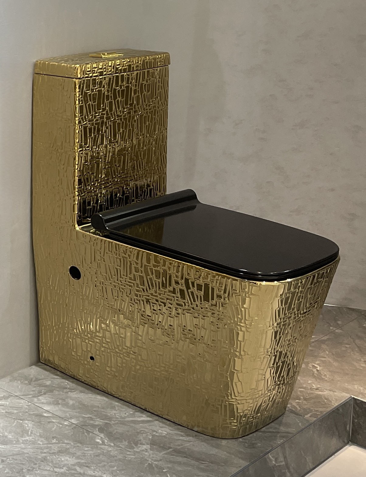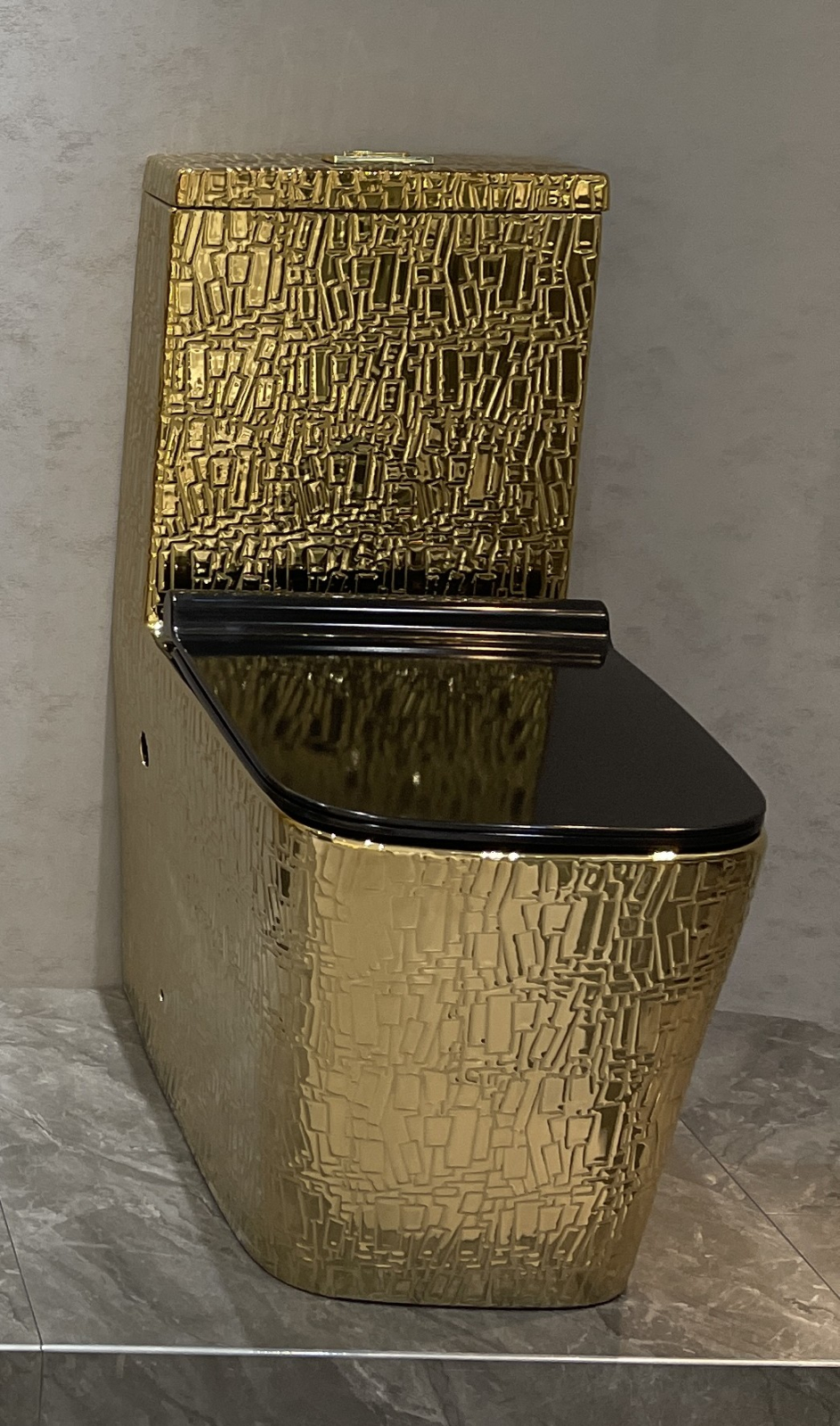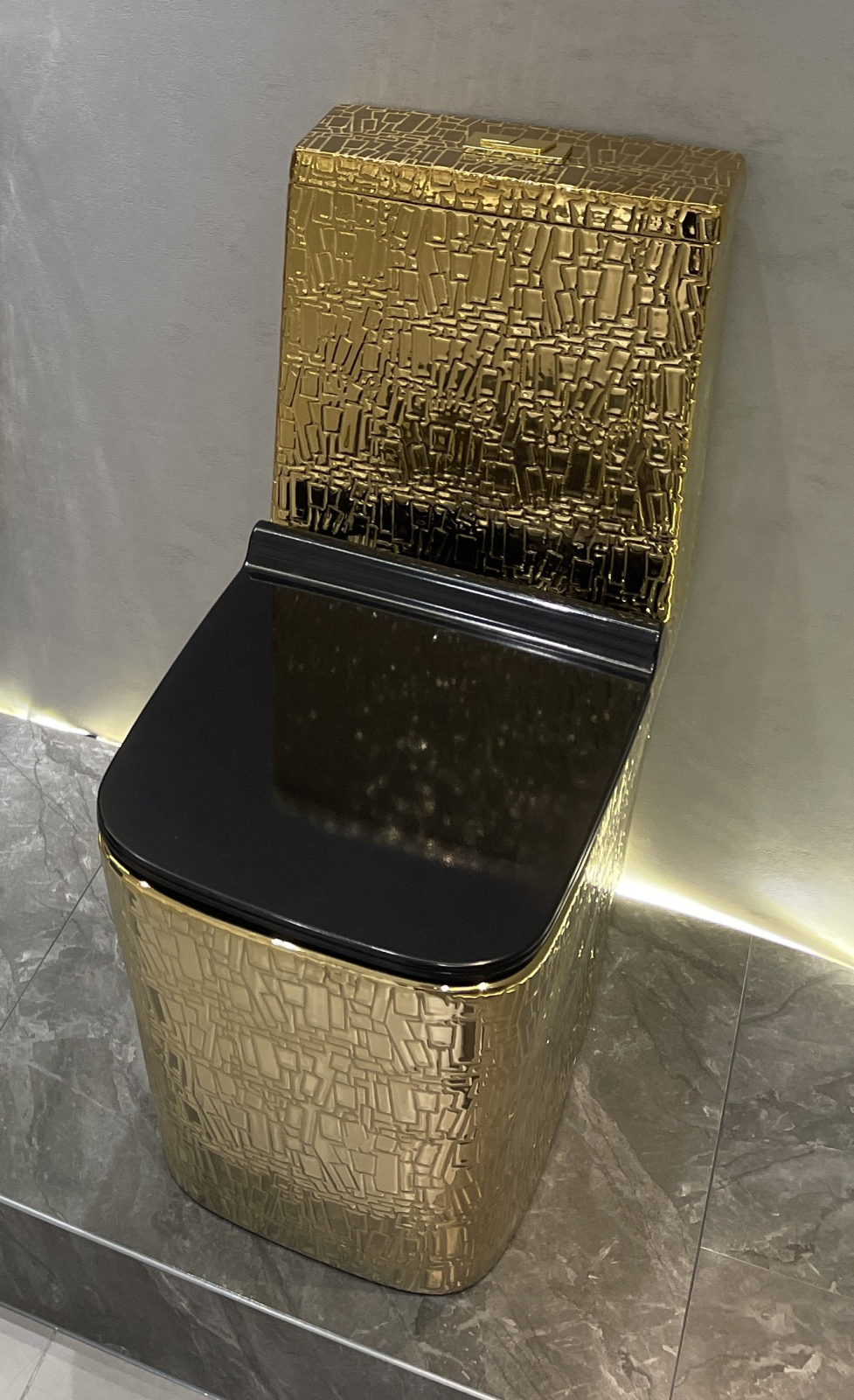 Transformă baia într-un spațiu de lux cu acest set de vas WC premium, conceput pentru a combina eleganța rafinată cu performanța modernă. Fabricat din ceramică sanitară de înaltă calitate, acest model se remarcă printr-un finisaj auriu glazurat spectaculos, completat de un capac negru slim soft-close, ce adaugă un contrast sofisticat.