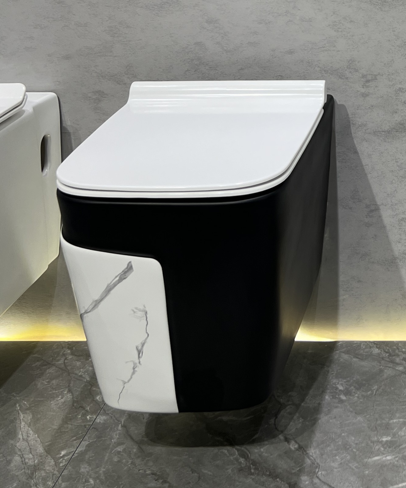 Redefinește eleganța băii tale cu acest vas WC suspendat cu design modern și finisaj marmură/negru, o combinație rafinată de stil și funcționalitate. Realizat din ceramică sanitară de înaltă calitate, acest model oferă durabilitate, igienă superioară și un aspect contemporan, ideal pentru băile moderne.