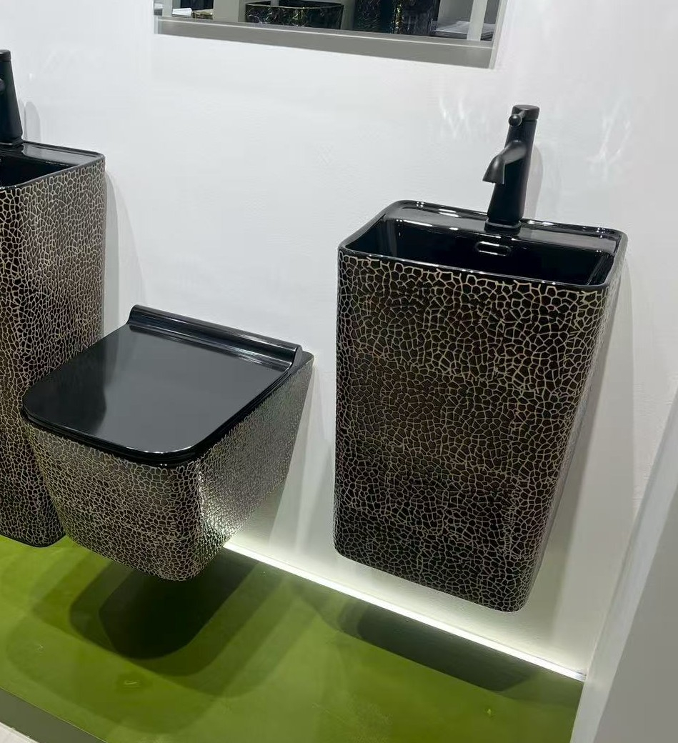 Acest vas WC suspendat impresionează prin designul său extravagant și finisajul glazurat negru/auriu, ce imită o textură decorativă de tip piele exotică. Este o piesă de lux pentru băile moderne, oferind un aspect sofisticat și un caracter distinct. Datorită montajului suspendat, spațiul pare mai aerisit, iar curățarea pardoselii devine mult mai simplă.