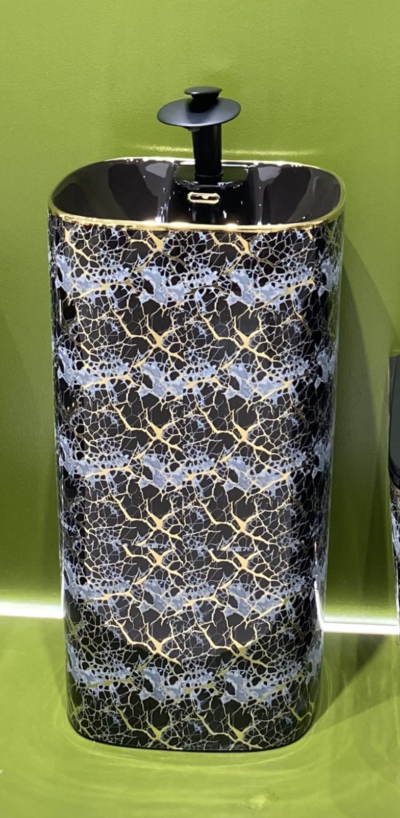 Lavoar freestanding din ceramică sanitară, cu un design spectaculos în finisaj albastru-negru și accente aurii. Cu dimensiuni de 46 x 38 x 84 cm, acest lavoar stativ aduce un aspect luxos și modern băii, fiind ușor de întreținut datorită suprafeței vitrificate. Ideal pentru amenajări premium și spații elegante.
