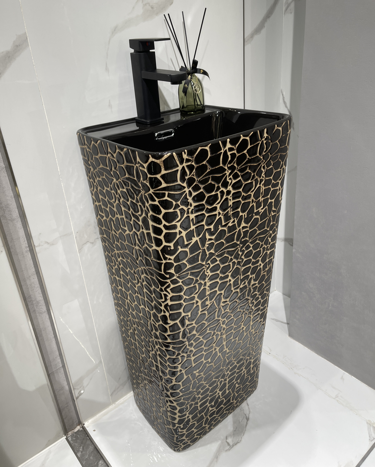 Lavoarul stativ freestanding este realizat din ceramică sanitară de înaltă calitate, fiind conceput pentru a aduce un plus de rafinament și personalitate băilor moderne. Designul său vertical, cu linii curate și proporții echilibrate, îl face ideal pentru băi contemporane, spații premium sau amenajări cu accent decorativ puternic.