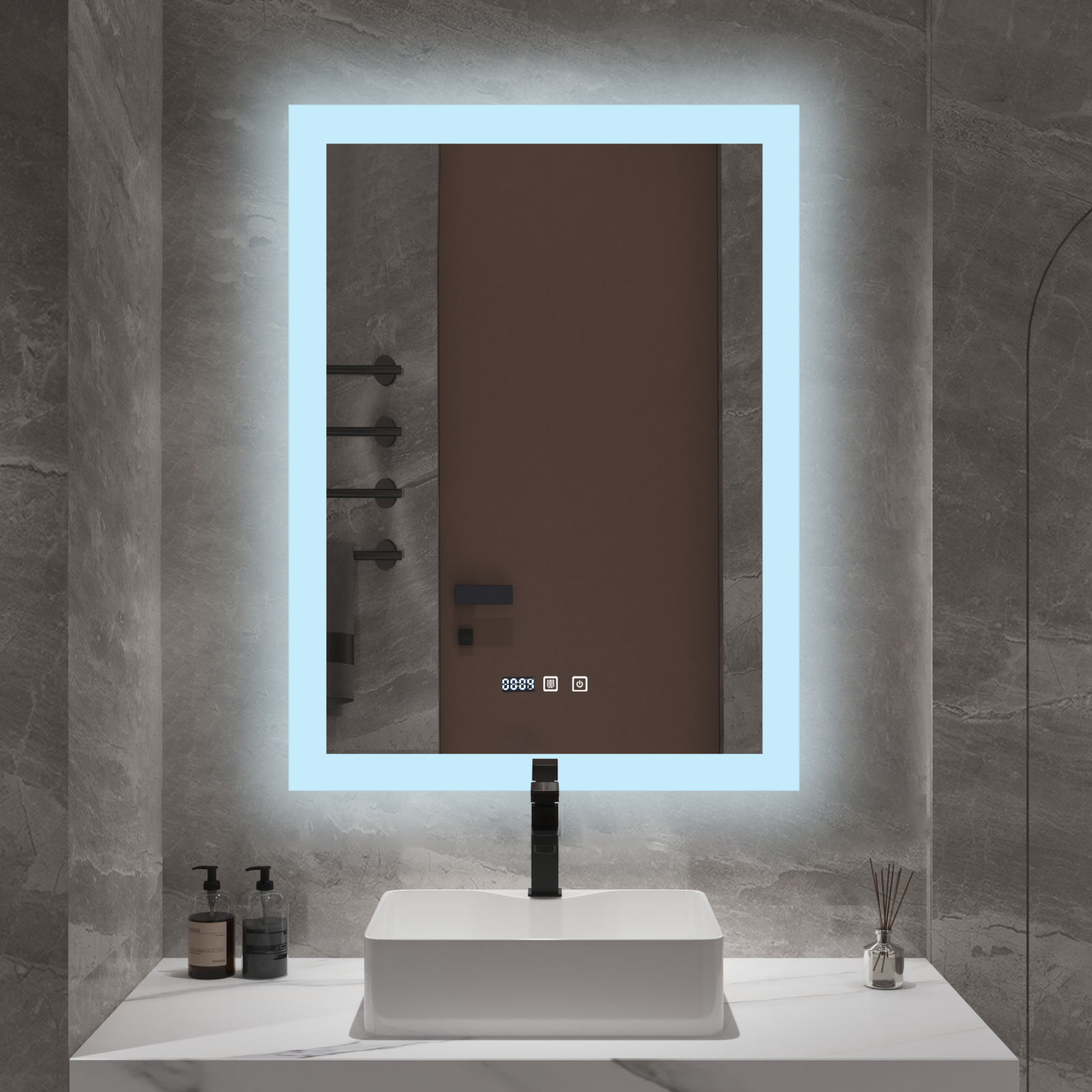 Oglinda este prevăzută cu iluminare LED perimetrală, uniformă, reglabilă prin atingere: