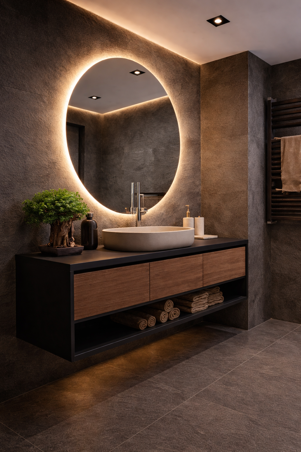 Set modern culoare ce imita  lemnul natural și negru mat, format din mobilier suspendat (120×50×50 cm), lavoar ceramic elegant (60×44×15 cm) și oglindă rotundă cu iluminare LED (100×100 cm). Design contemporan, materiale rezistente la umiditate și spațiu generos de depozitare – combinația perfectă între stil și funcționalitate.