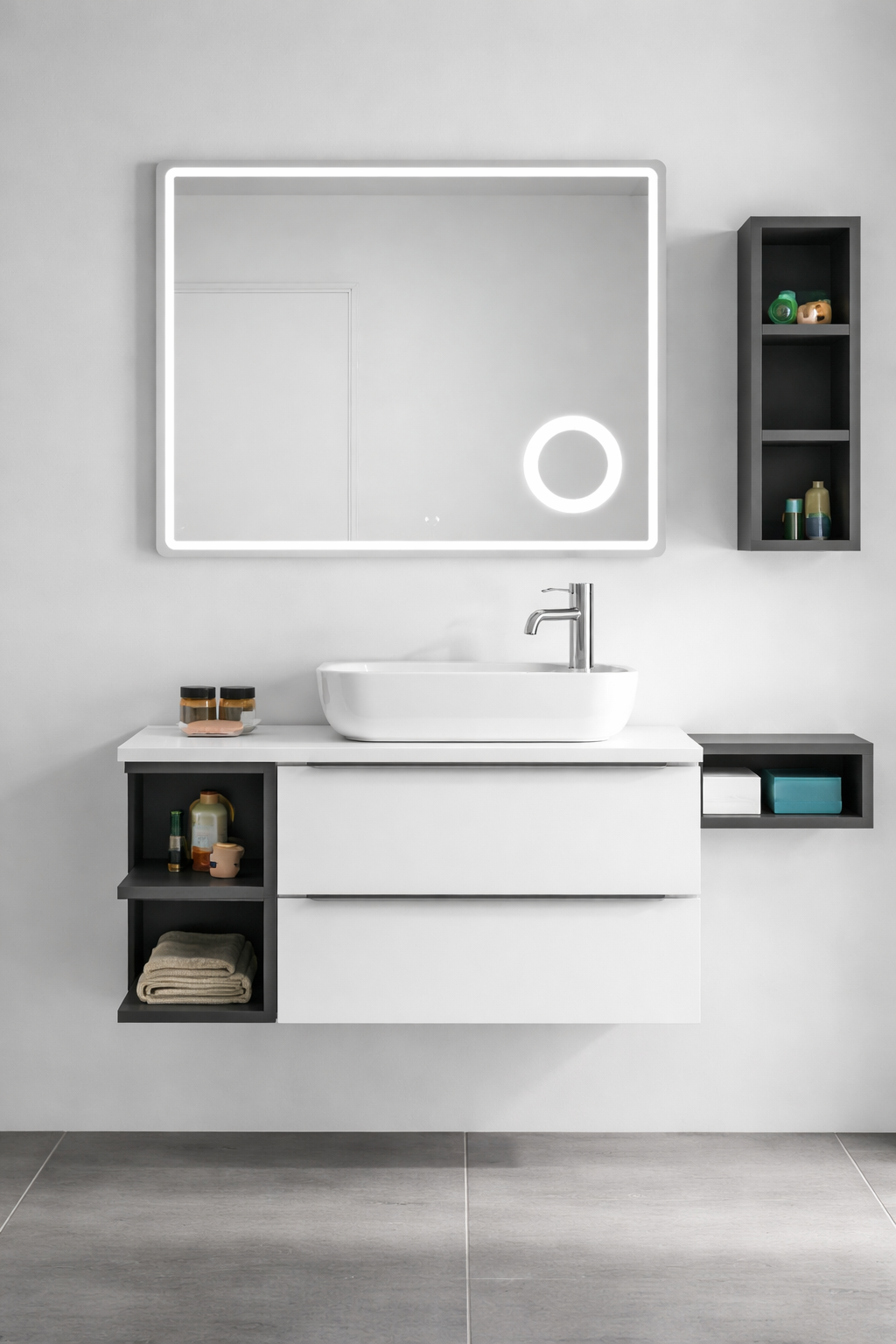 Acest set complet de mobilier pentru baie îmbină perfect eleganța minimalistă cu funcționalitatea, fiind ideal pentru spațiile moderne. Realizat din PVC premium, rezistent la umiditate și ușor de întreținut, setul include mobilierul principal suspendat, lavoar ceramic, oglindă LED cu iluminare uniformă și un corp suspendat pentru depozitare suplimentară.