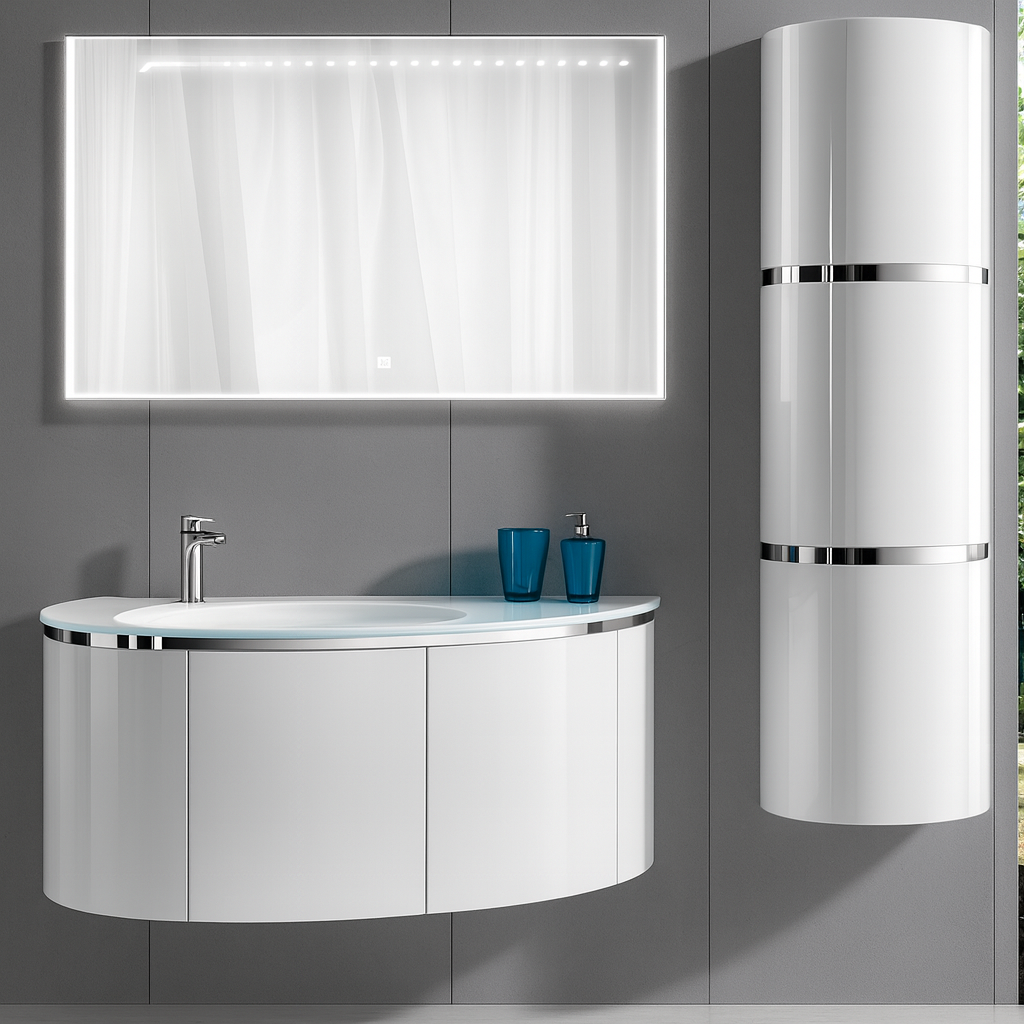 Acest set de mobilier pentru baie combină estetica modernă cu funcționalitatea avansată, oferind un aspect elegant datorită liniilor curbate și finisajelor lucioase. Realizat din materiale durabile și rezistente la umiditate, setul include mobilier suspendat din PVC, lavoar din sticlă modern, oglindă LED cu iluminare perimetrală și un corp suspendat generos pentru depozitare suplimentară.