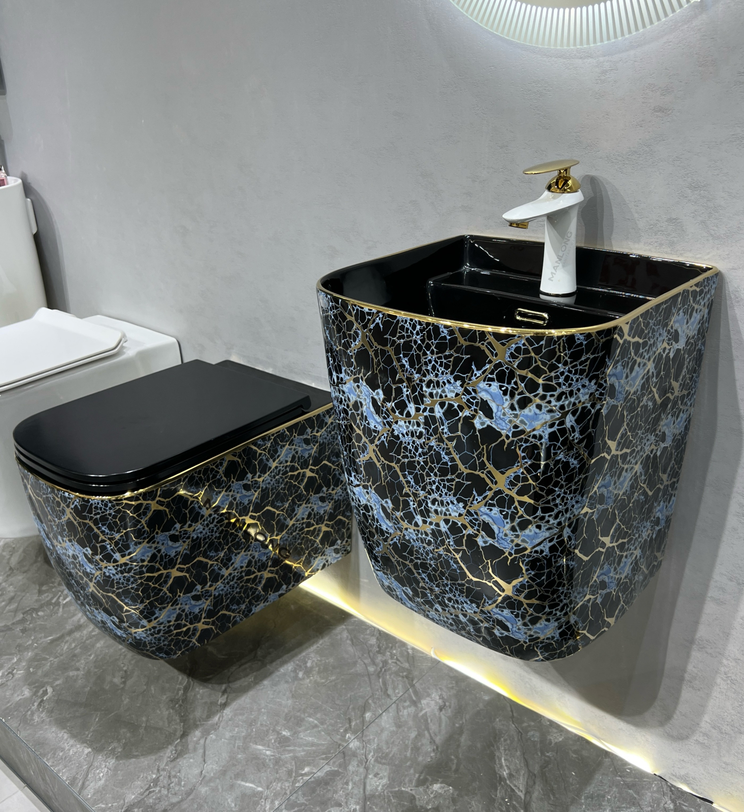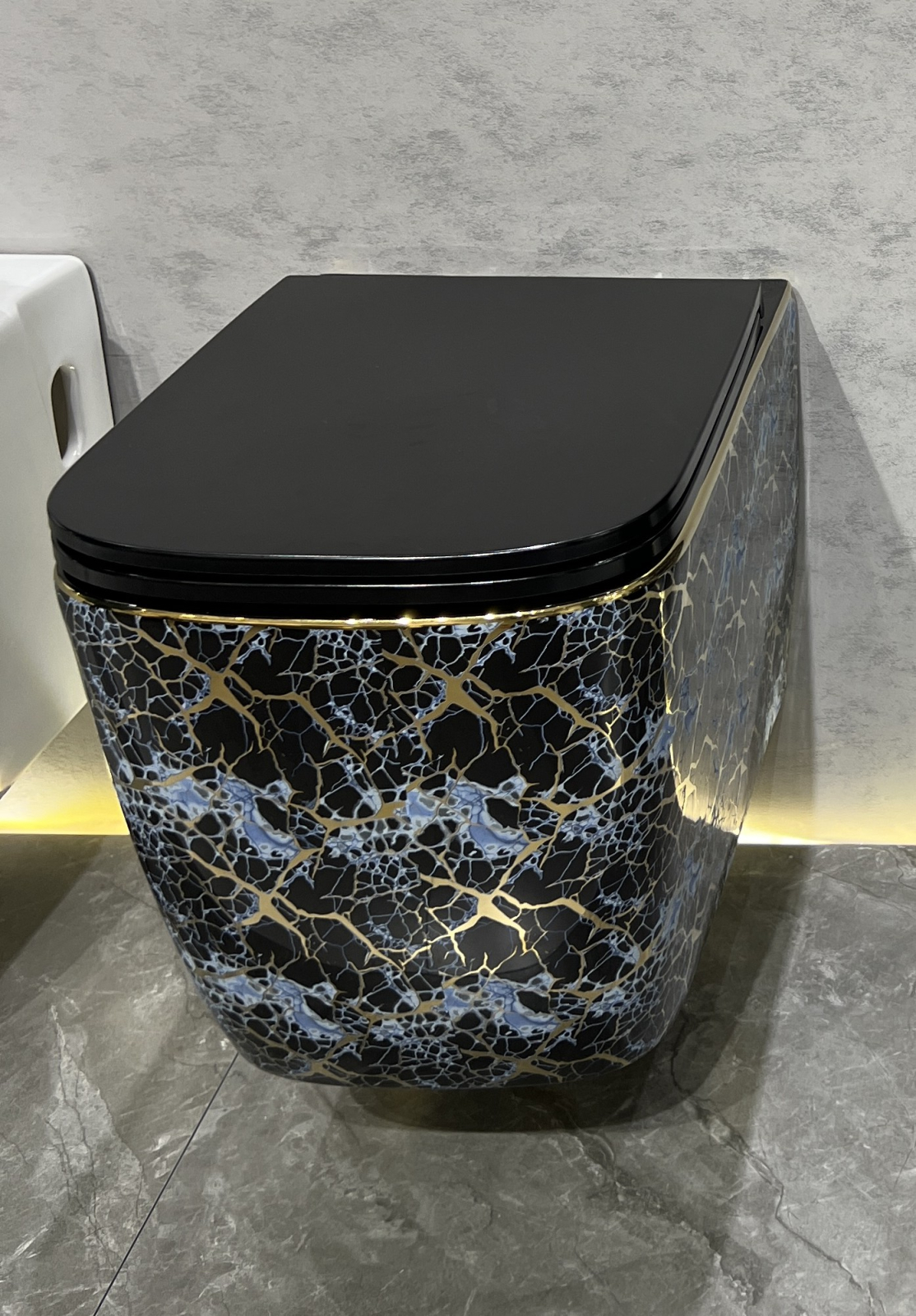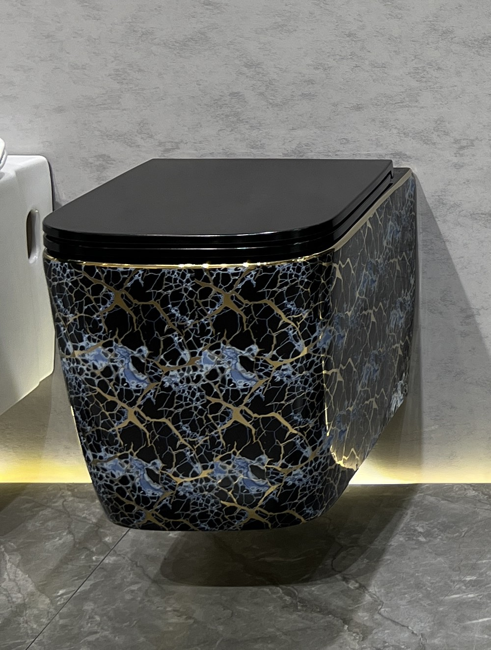 Acest vas WC suspendat combină perfect eleganța unui finisaj artistic cu performanța tehnologiilor sanitare moderne. Modelul albastru-negru cu accente aurii creează un efect vizual spectaculos, transformând vasul într-un element de decor rafinat, ideal pentru băi premium sau spații contemporane.