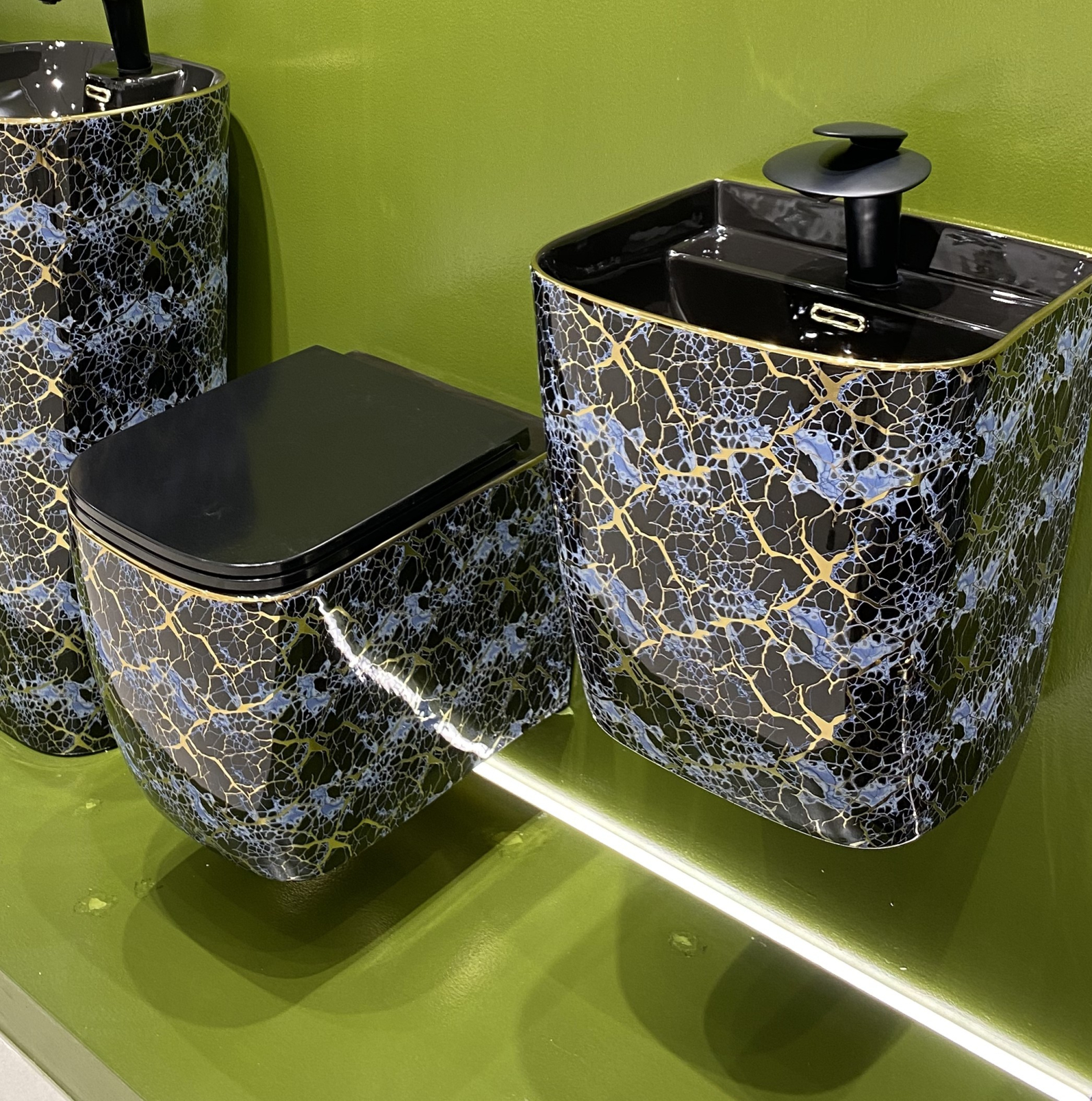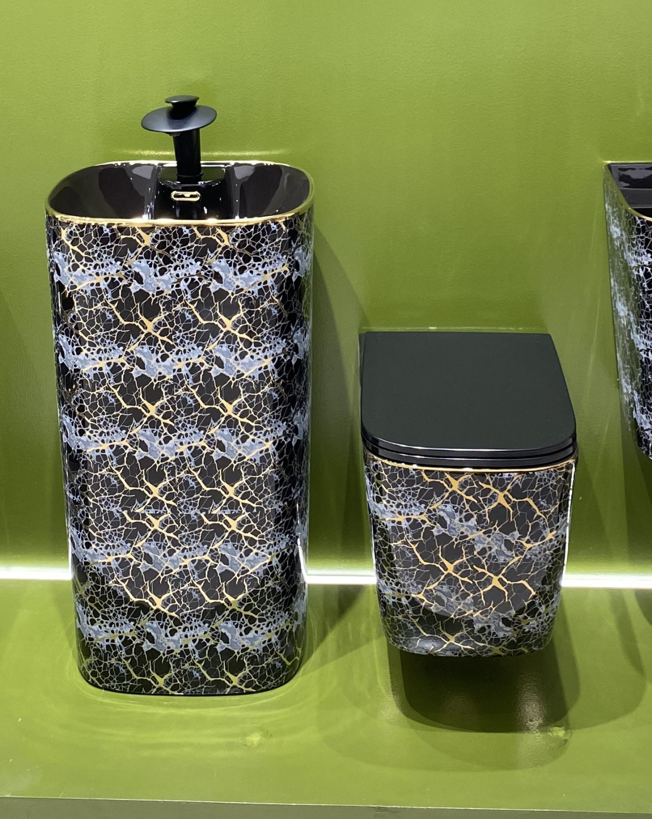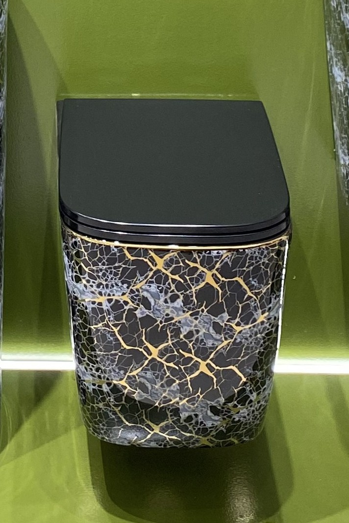 Acest vas WC suspendat combină perfect eleganța unui finisaj artistic cu performanța tehnologiilor sanitare moderne. Modelul albastru-negru cu accente aurii creează un efect vizual spectaculos, transformând vasul într-un element de decor rafinat, ideal pentru băi premium sau spații contemporane.