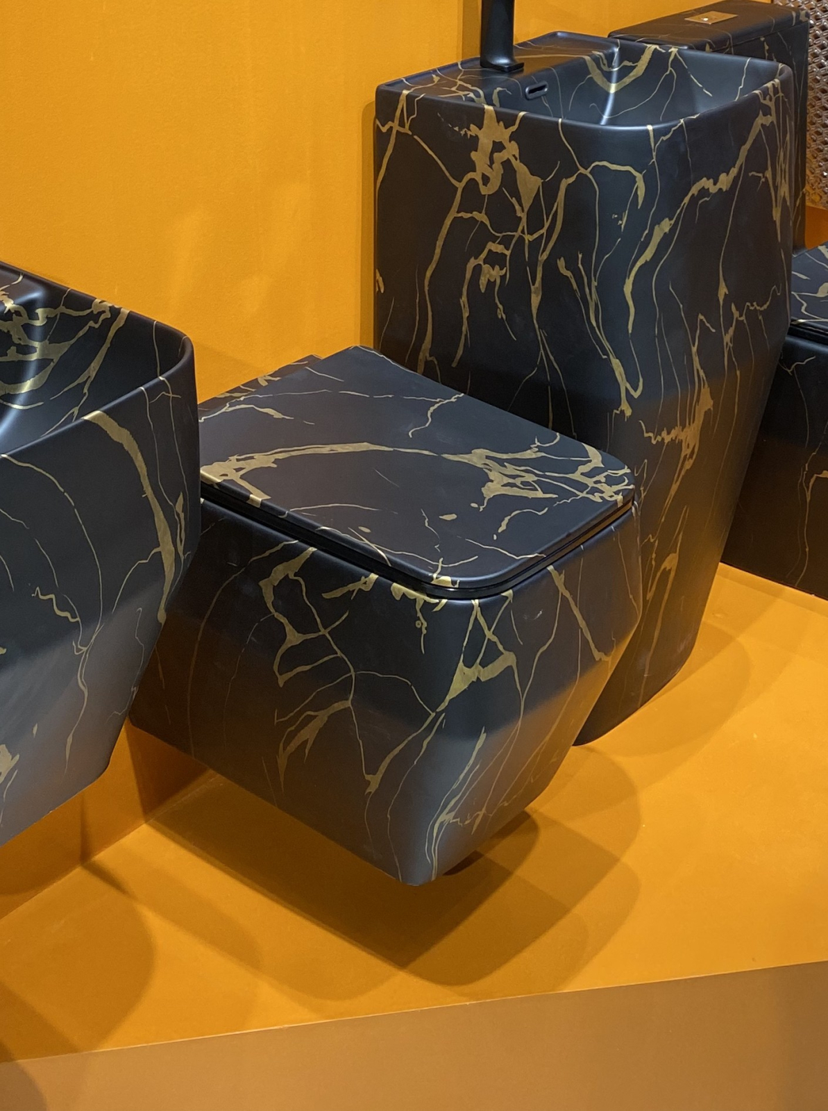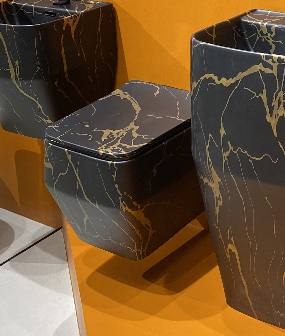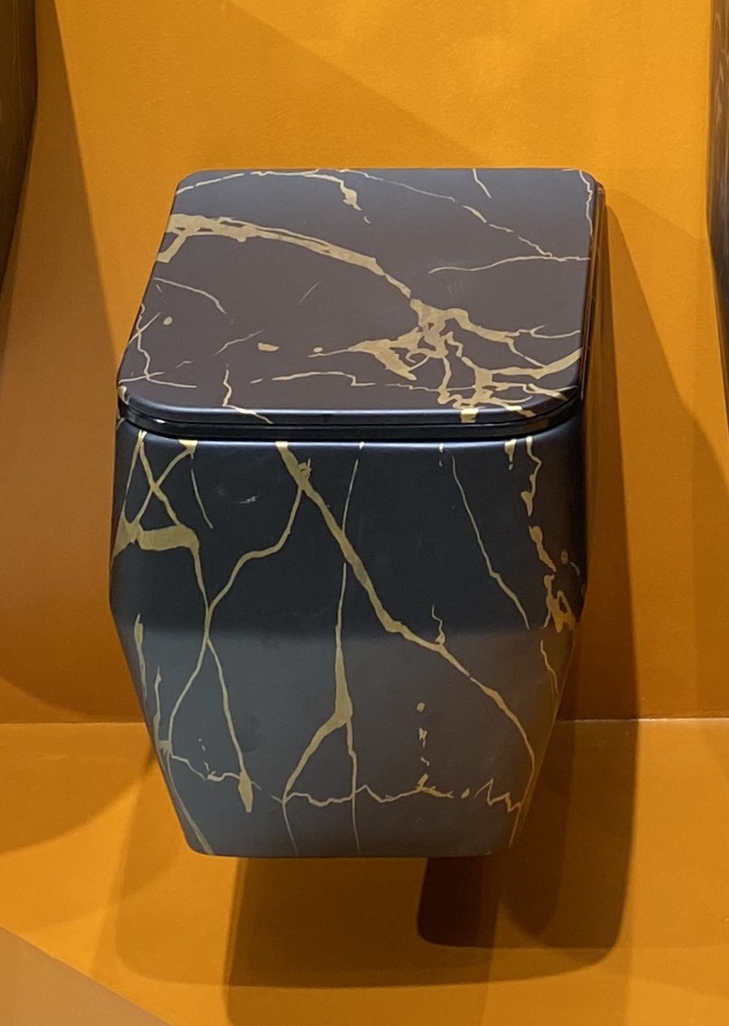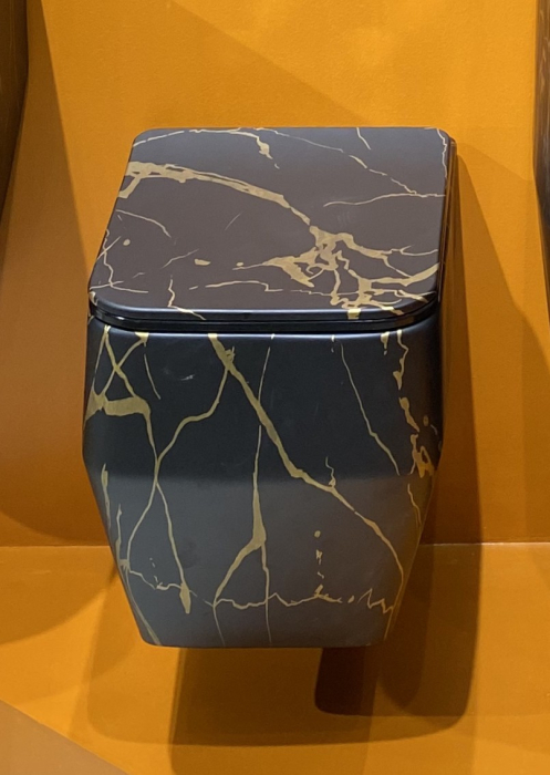 Vas WC suspendat modern, cu tehnologie Rimless și capac soft-close, realizat din ceramică premium. Finisajul elegant negru cu vene aurii tip marmură oferă un aspect luxos și rafinat oricărei băi. Dimensiuni compacte – 54 x 36 x 36 cm – potrivite pentru spații moderne sau minimaliste. Ușor de curățat, igienic și compatibil cu majoritatea sistemelor încastrate.